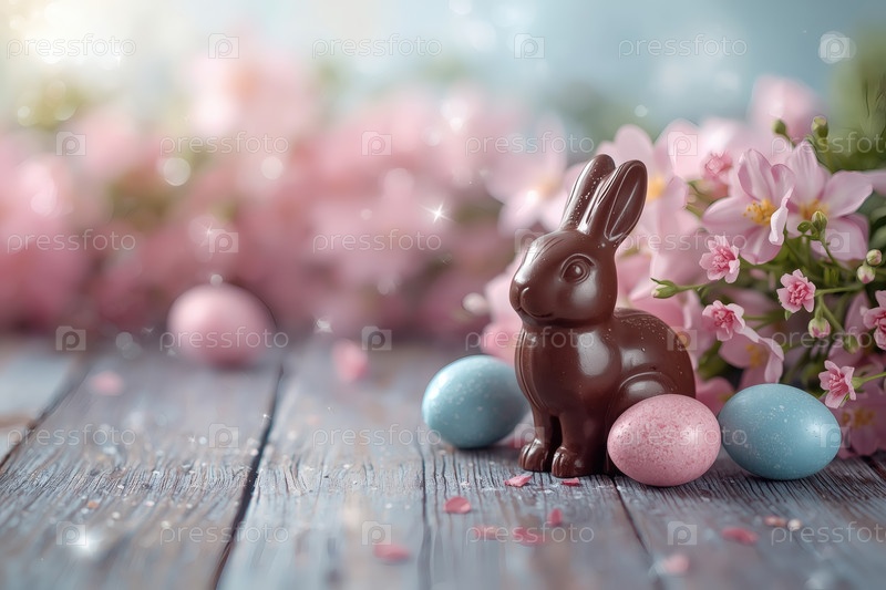 Пасхальные сладости и лакомства. Концепция ярких пасхальных праздников в 2026 году. Хорошая открытка. Баннер. Шоколадные пасхальные яйца, шоколадный кролик и весенние цветы на деревянном фоне