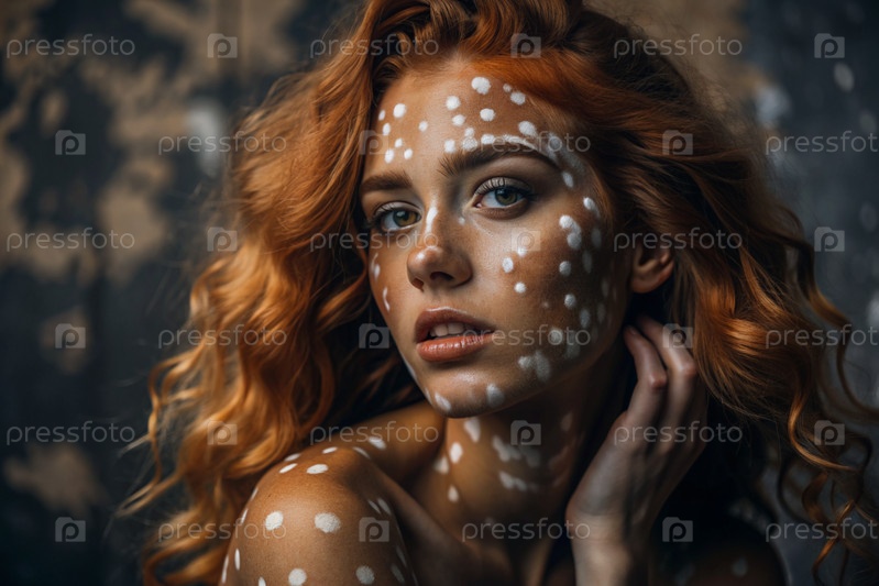Лейкодермия. Витилиго. Плохая пигментация кожи. Большие белые пятна по всему телу и лицу. Портрет красивой девушки с кожными заболеваниями