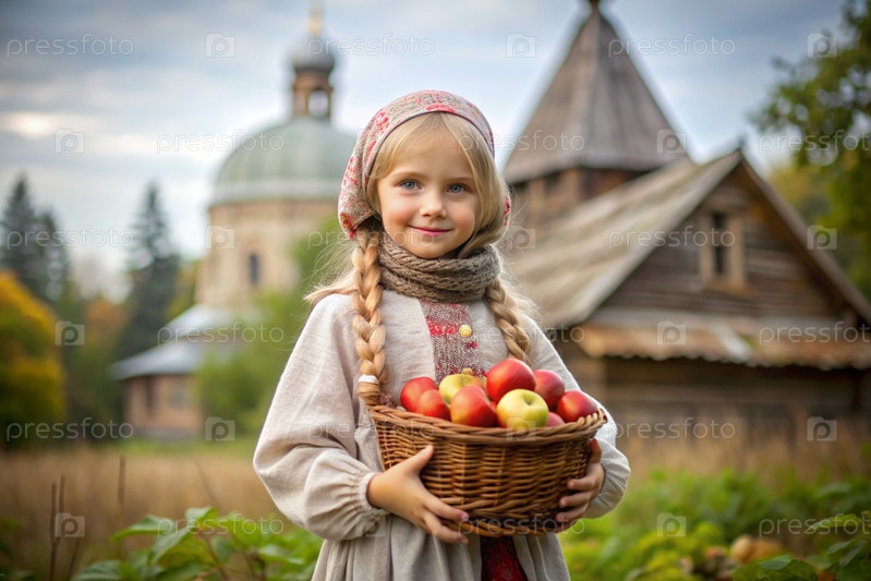 Концепция русского православного праздника Apple resort. Красивая девочка в российской национальной одежде и шарф с корзиной спелых красных яблок на фоне Православной церкви
