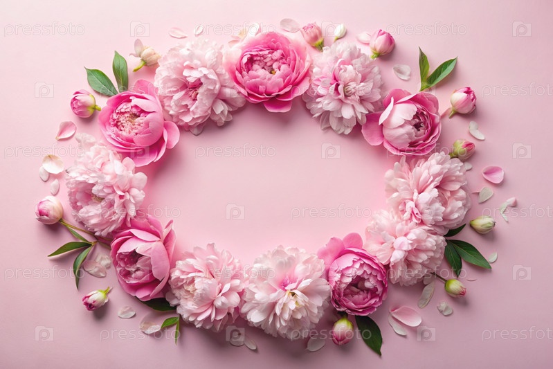 Рама с красивыми цветками пионки на пастельно-розовом фоне.Плоская планировка, верхний вид, место копирования, летние цветы