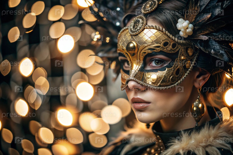 Карнавал Венеции.Закрытие женщины в украшенной карнавальной маске.Яркие цвета передают атмосферу празднования и роскоши