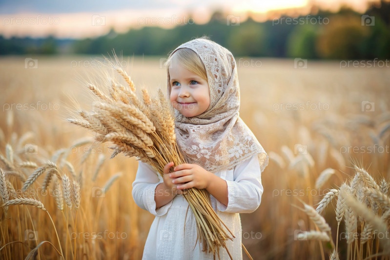 Русская девушка в белом платье и русском шале держит золотые колосья пшеницы на фоне созревающего поля. Концепция посадки и сбора богатого урожая. Сельский пейзаж