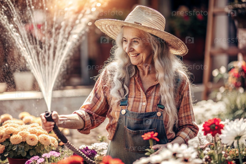 Пожилой садовник с седыми волосами в комбинезоне в уютной цветочной теплице