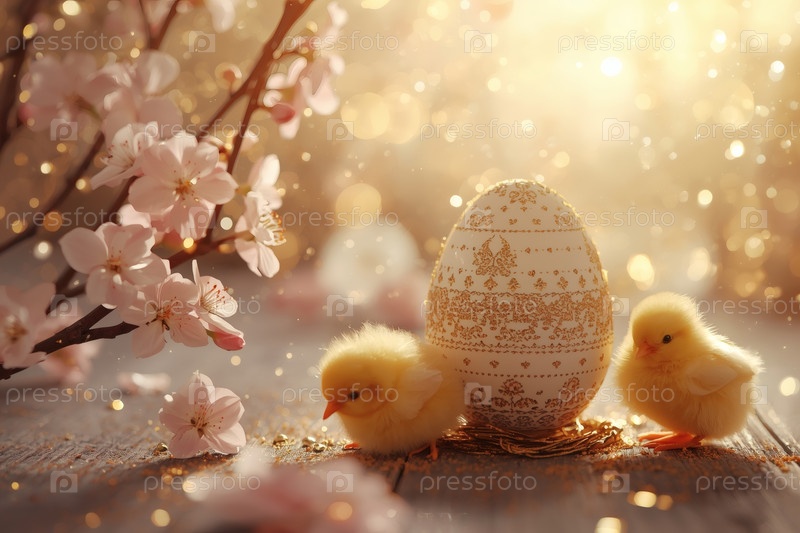 Концепция яркого Пасхального праздника. Нежные розовые пасхальные яйца, желтые курицы и вишневые ветви на деревянном фоне. Концепция ярких пасхальных праздников в 2026 году