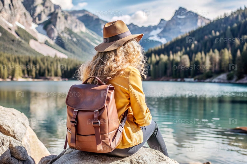 Женщина с кудрявыми светлыми волосами сидит на скале со рюкзаком на спине среди живописного озера и гор