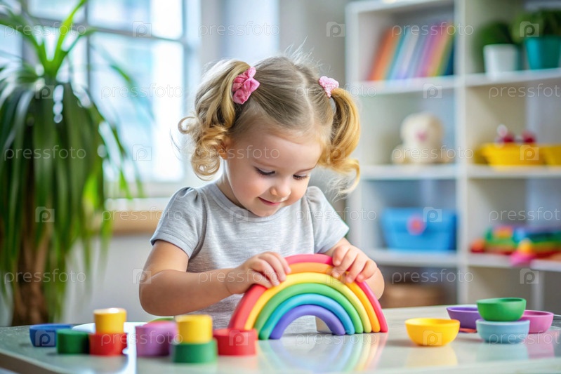 Игрушки.Маленькая девочка играет в образовательные игры.Радужная детская игрушка, цветные пирамиды и логические игрушки для детей.Монтессори-игры для развития ребенка
