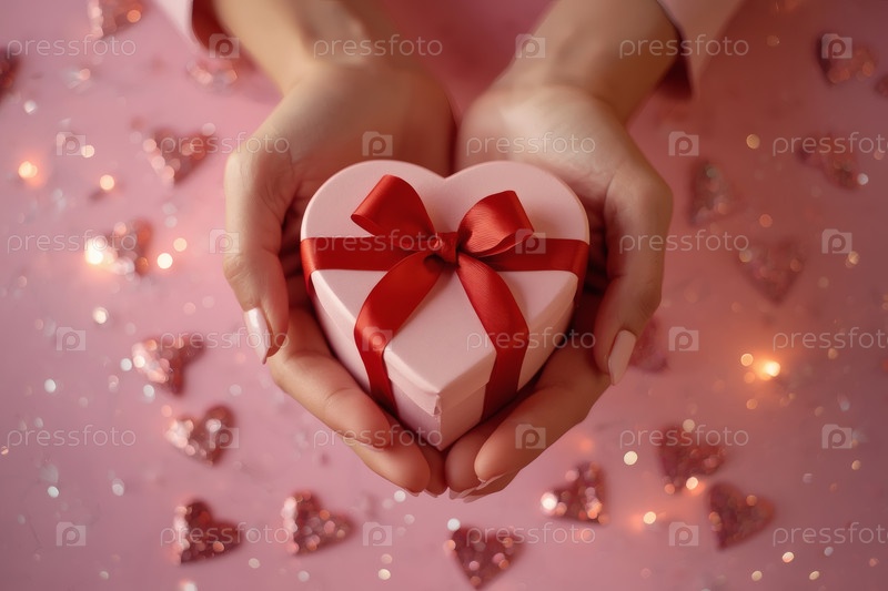 Руки женщины, держащей подарок в форме сердца с красной лукой на День святого Валентина