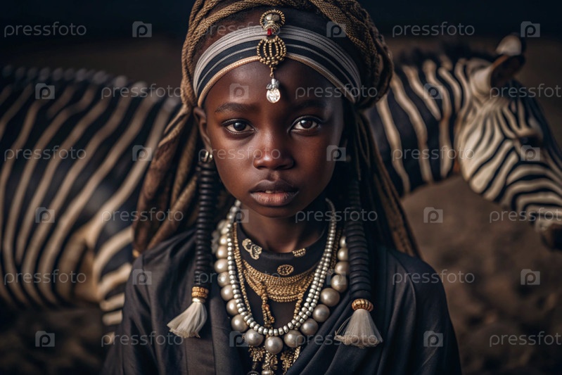 Красивая африканская девушка в традиционном национальном костюме против зебры портрет символизирует традиции и красоту африканского народа