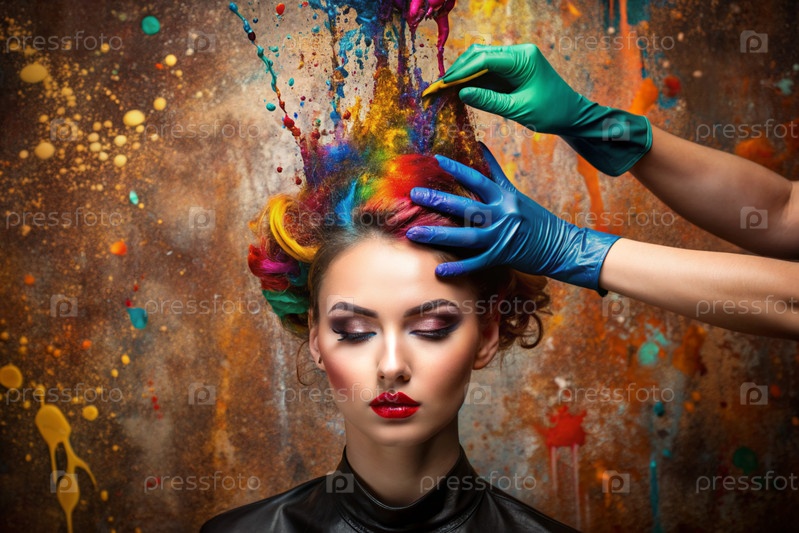 Творческий баннер для салона красоты или парикмахера. Модное профессиональное окрашивание волос. Красивая женщина с длинными многоцветными волосами. Взрыв цветов на голове