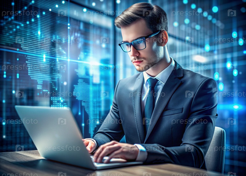 Молодой человек в костюме работает на ноутбуке в офисе с цифровыми кодами на виртуальном экране Цифровые технологии будущего Разработка программного обеспечения