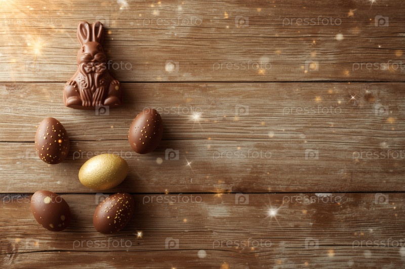 Концепция ярких пасхальных праздников в 2026 году. Красивая открытка. Баннер. Шоколадные пасхальные яйца и шоколадное зайцо на деревянном фоне. Пасхальные сладости и лакомства