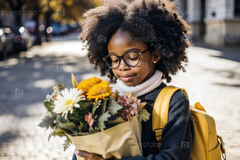 Красивая афроамериканка на очках с букетом осенних цветов впервые идет в школу. Ребенок со школьной сумкой, книгой и цветами. Малыш на городской улице