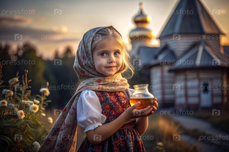 Концепция российского православного праздника 'Мед Спаситель' - красивая маленькая девочка в русской национальной одежде и шарф с баночкой меда на фоне православной церкви