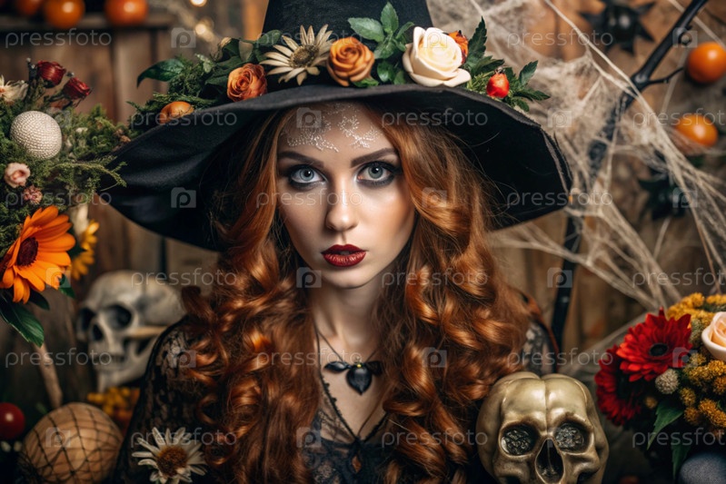 Концепция Хэллоуина. Ужасное. Костюмированная вечеринка. Красивая женщина в костюме ведьмы. Баннер, открытка