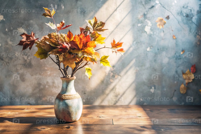 Ветви с золотыми осенними листьями в керамической вазе на деревянном столе у окна. Концепция домашнего комфорта. Осенний декор для Хэллоуина
