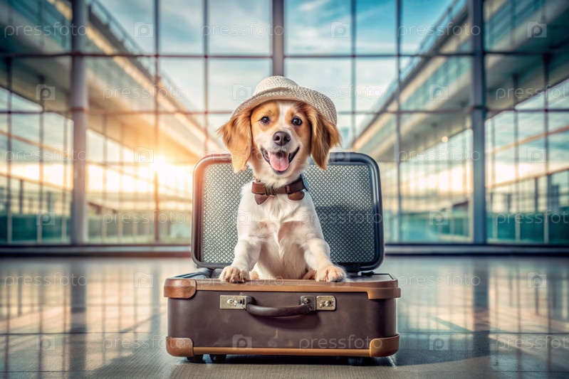 Стильный щенок в путешествии, очаровательная забавная собака сидит в открытом чемодане