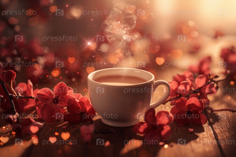 Чашка горячего кофе или чая, окруженная красными цветами и сердцами в День святого Валентина
