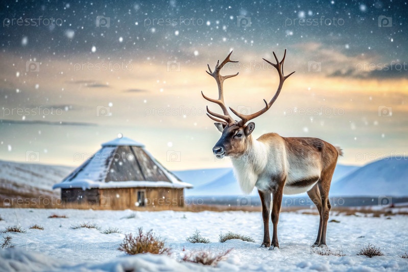 Олени пасутся против тундрового ландшафта и зимней юрты