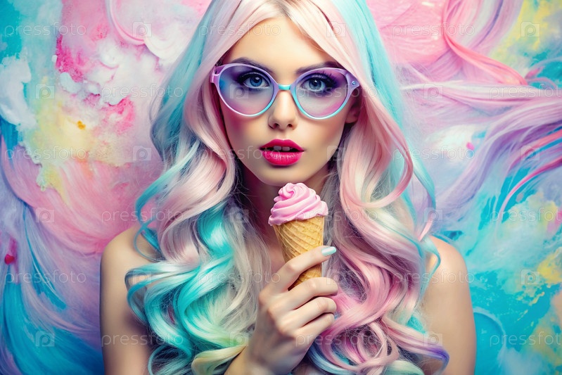 Молодая кудрявая девушка ест мороженое на улице в жаркий летний день