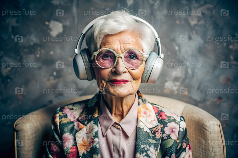 Стильная, современная, счастливая 60-70-летняя женщина слушает музыку в больших беспроводных наушниках дома, на стуле в гостиной