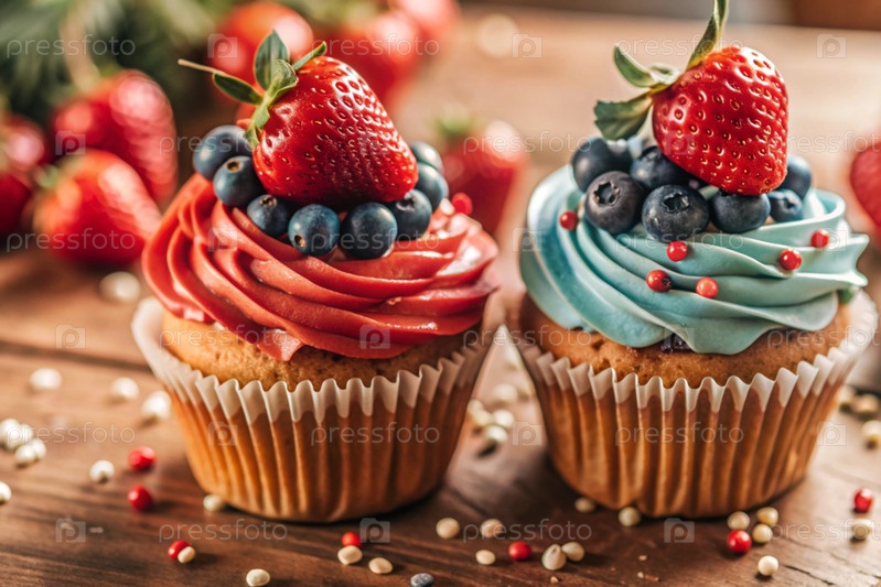 Вкусные красочные кексы со земляницами и чернилами. праздничный кекс, который идеально подходит для веселых торжеств. счастливого дня рождения