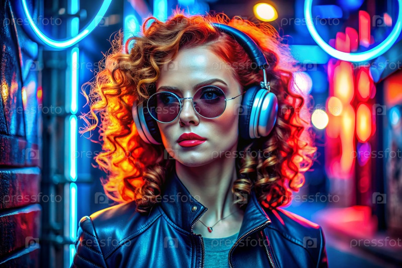 Молодая красивая девушка в солнцезащитных очках слушает музыку на больших беспроводных наушниках, стоя в неонном туннеле среди неоновых вывесок