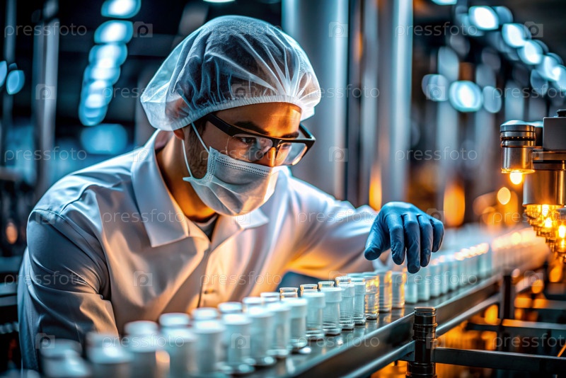 Производство лекарств: фармацевт тестирует медицинские флаконы на автоматическом трубопроводе фармацевтической производственной линии с использованием искусственного интеллекта