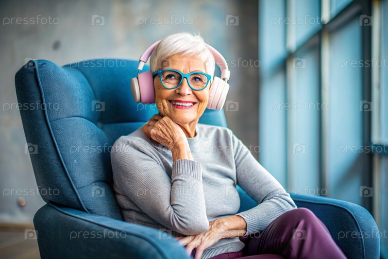 Стильная, современная, счастливая 60-70-летняя женщина слушает музыку в больших беспроводных наушниках дома, на стуле в гостиной