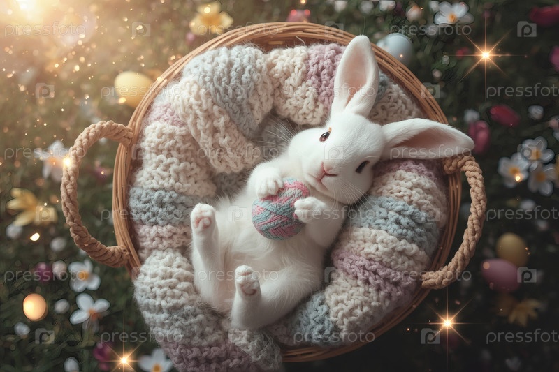 Пасхальный кролик пасхальное яйцо в лапах, лежащее на спине на сером вязанном одеяле в корзине из колючки и уставившееся в камеру
