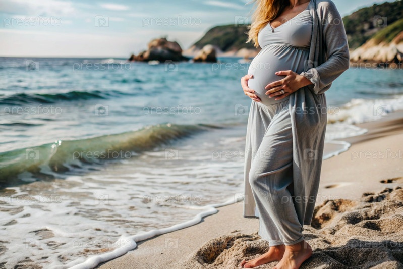 Расслабление, спокойствие, морской воздух. Закрытие живота. Беременная женщина на пляже у моря. Концепция беременности, родов и родительских обязанностей
