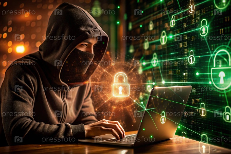 Хакер работает на ноутбуке, цифровые коды на виртуальном фоне. взлом и защита онлайн-данных. цифровые технологии, разработка программного обеспечения
