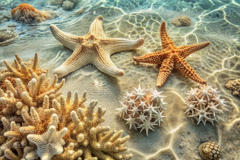 Концепция летних каникул. Подводный мир. Кораллы и морские звезды под водой. Красивый абстрактный фон для баннера