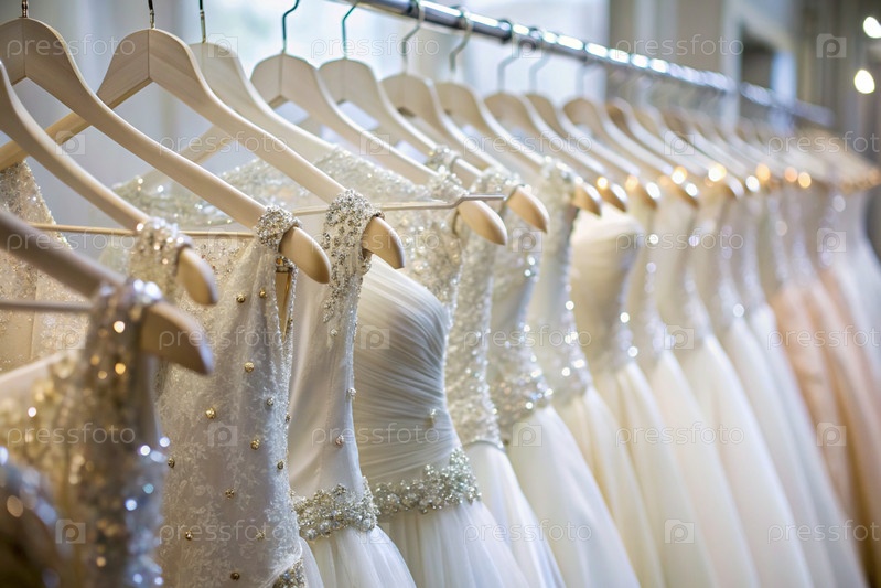 Аренда и покупка свадебных платьев для мероприятий. Близкие. Свадебные белые платья висят с белых вешалок на стойке в свадебном салоне магазина