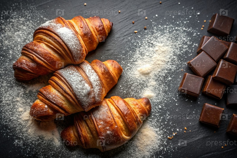 Вкусные свежевыпеченные кроассанты на тёмном фоне сланца. французский завтрак. хорошие ближневые выпечки. пекарня со вкусным хлебом. кондитерские изделия