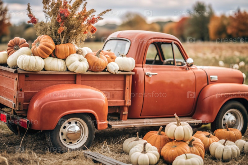Осень, осенний дизайн.Большой урожай тыквы на заднем сиденье ретро-пикапа, крупный план