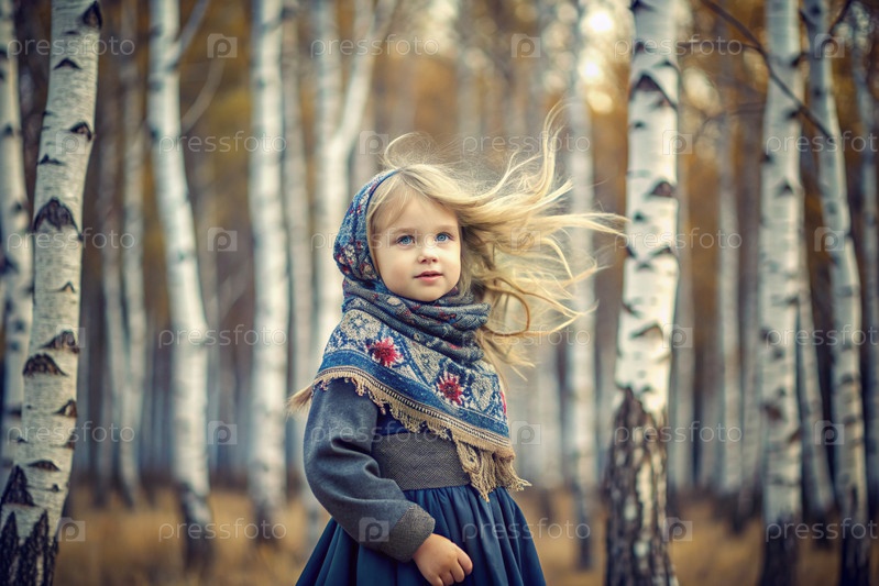 Русские народные традиции.Русский аромат.Красивая девочка в национальном русском платье и шарфе в красивом березовом роще.Портрет прекрасной девушки в березном лесу