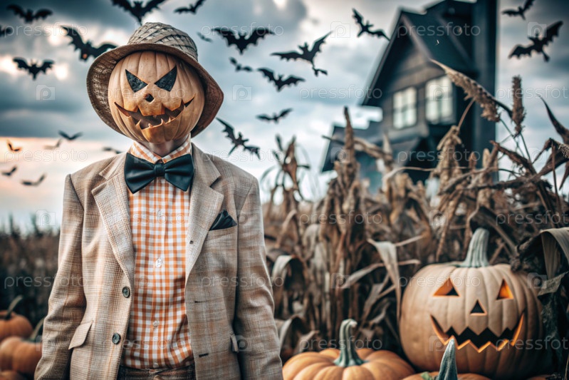 Концепция Хэллоуина. Ужасная. Страх. Устрашающий богий с тыквенной головой, квадратной рубашкой и бабочкой. Баннер, открытка