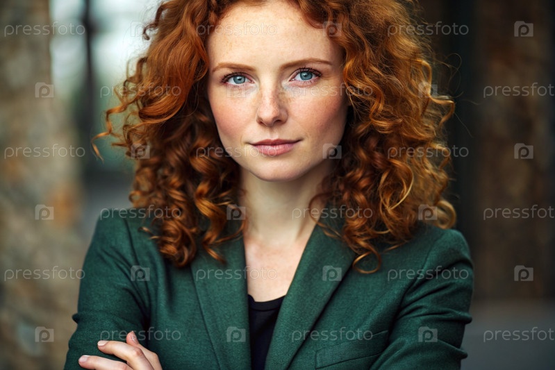Бизнес-леди с локоночными красными волосами и веснушками на лице.Она одета в непринужденный темно-зеленый блейзер и куртку.Руки пересекли его грудь, глядя прямо в камеру