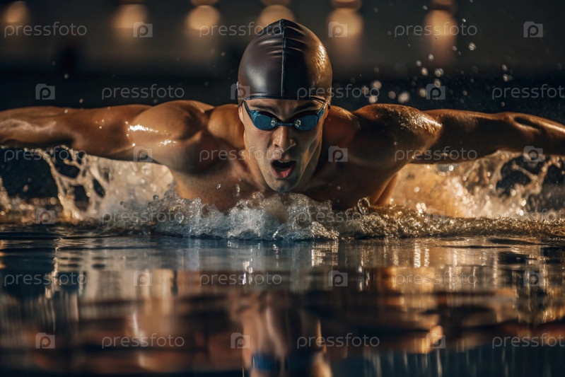 Спортивное плавание. Мужчины-плаватели. Спортсмен с очками в бассейне во время соревнований на близком расстоянии. Человек смотрит на камеру