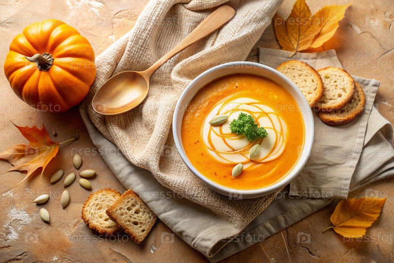 Традиционный мягкий тыквенно-кремовый суп с сливками и семьями тыквы на бежевом бетонном фоне