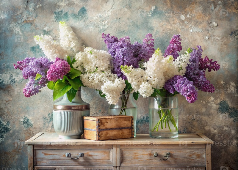Красивые белые и фиолетовые лиловые цветы в стеклянных вазах и бутылках на деревянном шкафу. Букет цветов в вазе. Светлый, белый, розовый и синий цветочный фон