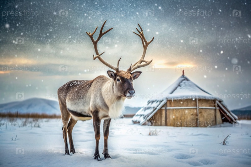 Олени пасутся против тундрового ландшафта и зимней юрты