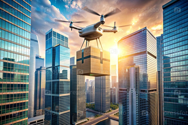 Технология будущего. Дрон доставки несет картонную коробку для человека на веревке. Дрон доставки летает между современными небоскребами. Концепция развития доставки товаров