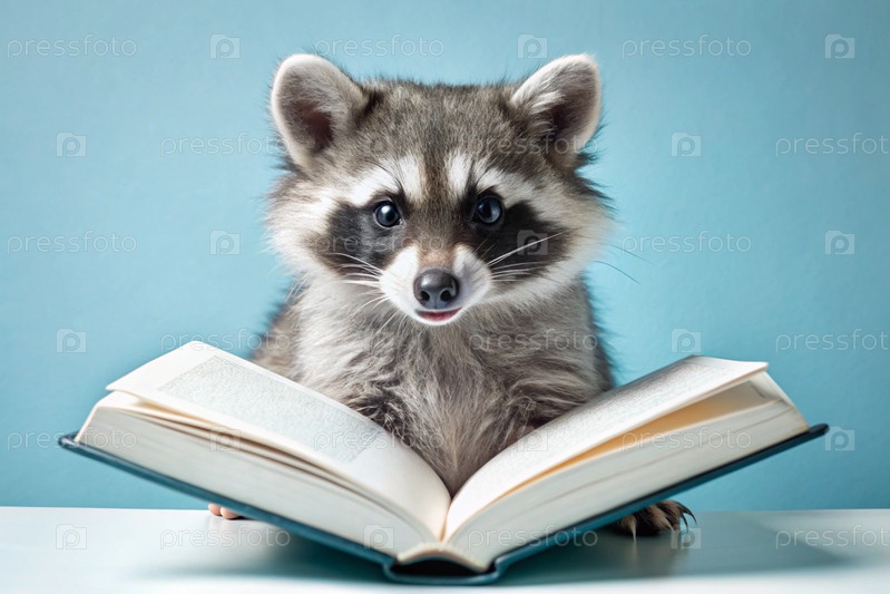 Забавный милый енот читает книгу на синем фоне