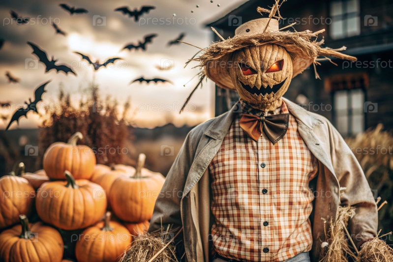 Концепция Хэллоуина. Ужасная. Страх. Устрашающий богий с тыквенной головой, квадратной рубашкой и бабочкой. Баннер, открытка