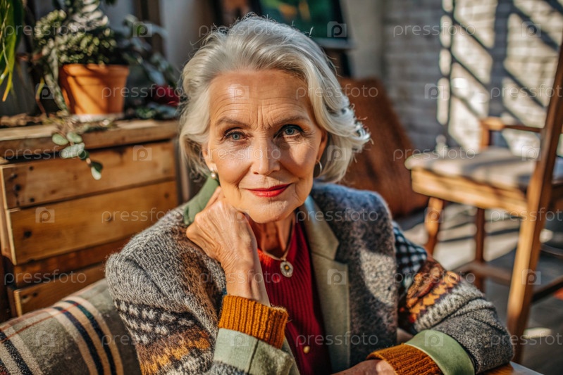 Минимализм.Студийный портрет стильной, элегантной пожилой женщины, 70-летнего пенсионера в интерьере и одежде спокойных тонов.Концепция пожилых людей