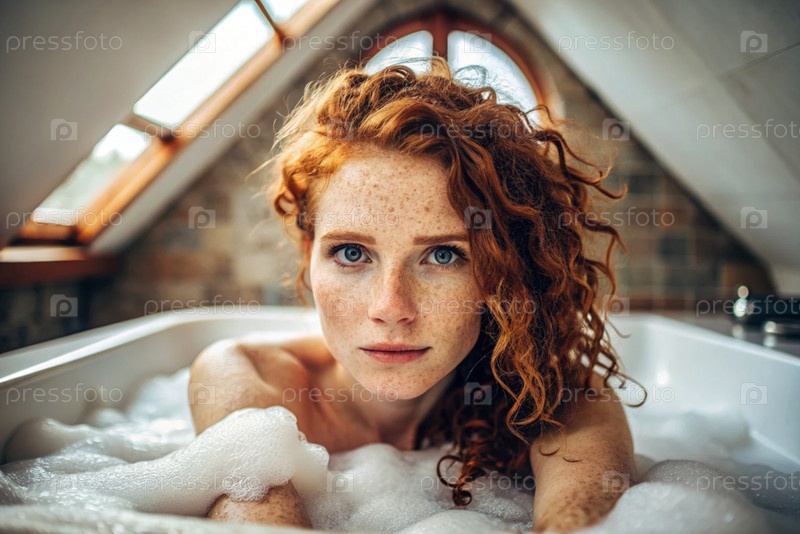 Близкий план красивой рыжеволосой женщины с веснушками и кудрявыми волосами, без макияжа. Она принимает баню из пузырьков. На заднем плане интерьер ванной комнаты в стиле лофт