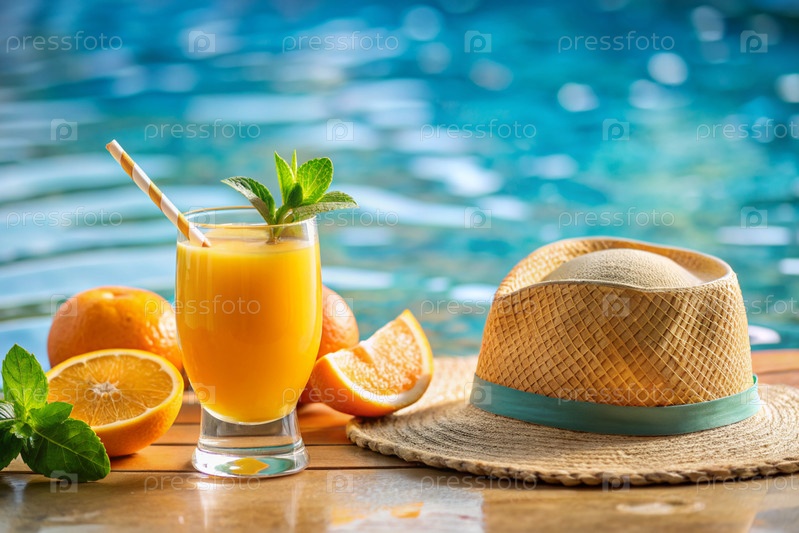 Стакан вкусного свежевыжатого апельсинового сока на фоне бассейна.Свежий апельсиновый сок с апельсином, кубиками льда и мятой