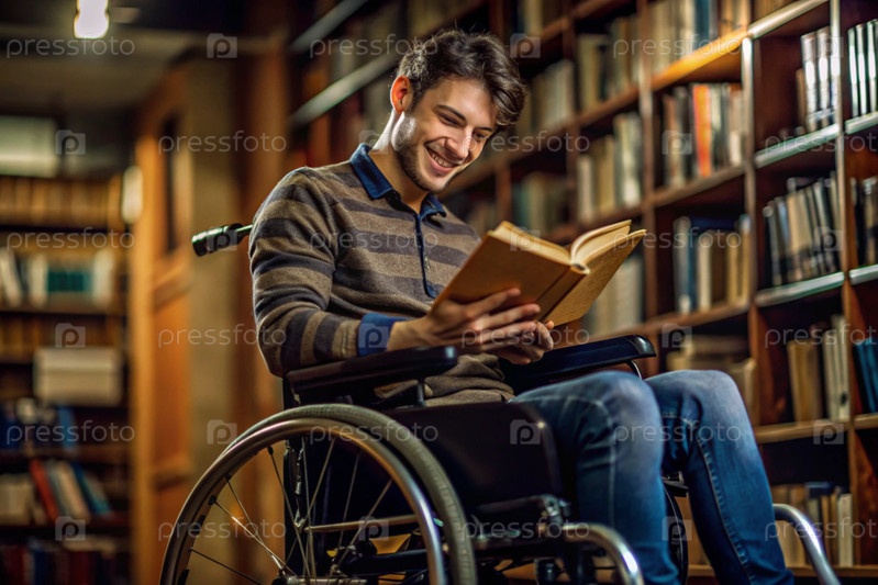 Инвалидность.Ребенок с инвалидностью в коляске читает книгу в библиотеке.Здоровье и медицина