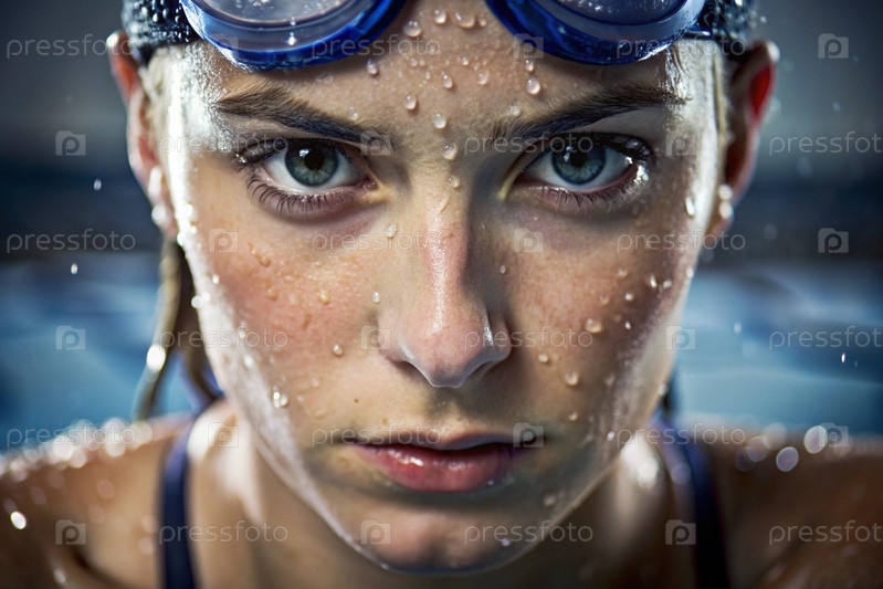 Спортивное плавание. Женское плавание. Спортсменка, которая носит очки для плавания в бассейне во время соревнований на близком расстоянии. Женщина смотрит прямо в камеру